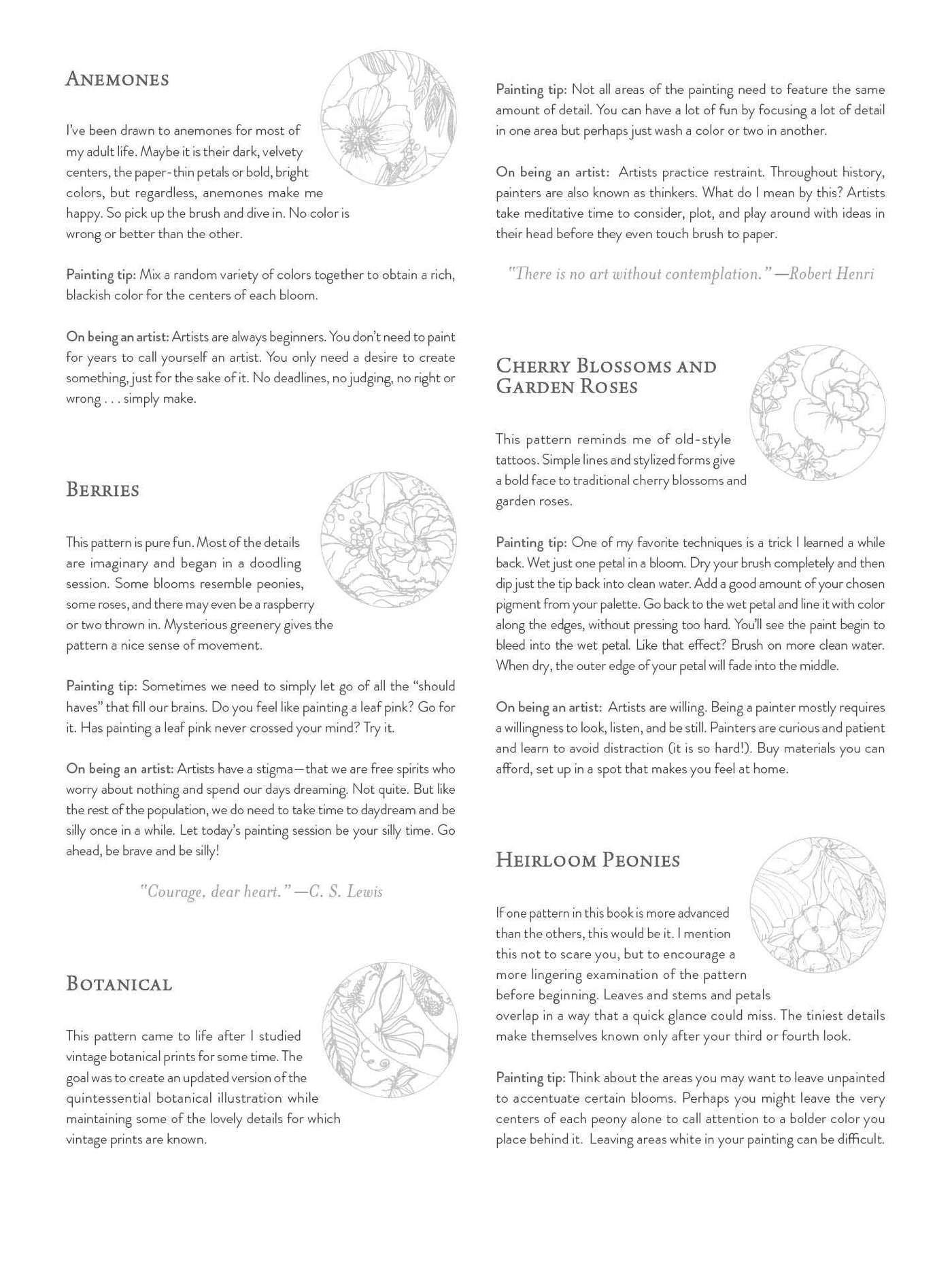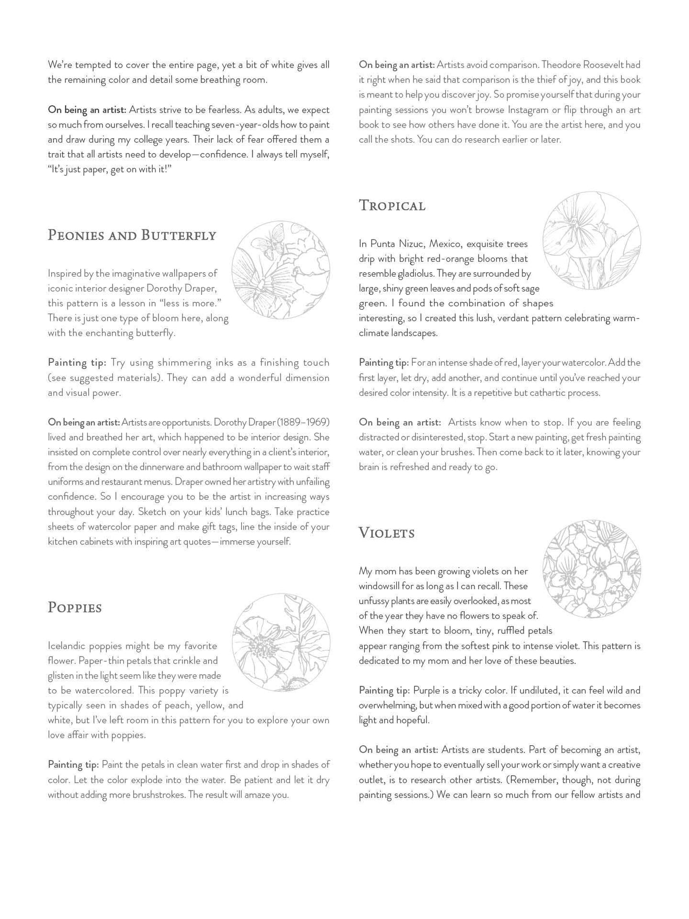 A book of 25 floral sketches printed on lovely watercolor paper invites artistic experimentation with only a brush and paint. Each page is double-sided, offering the opportunity to paint the same page in different ways. The author shares painting tips for each sketch and advice for discovering the artist within.